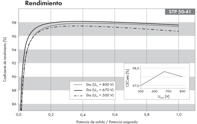 Cuenta con una curva de trabajo entre 500 y 800 V, con una tensión óptima de trabajo de 670 Vdc. Con una tensión distinta a la óptima, puede producirse una pérdida del rendimiento del 0.5 % en tensiones altas y hasta el 1.8 % en tensiones inferiores (alrededor de 500V).