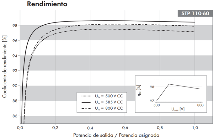 Dispone de curva de trabajo entre 500 y 800 V, con una tensión óptima de trabajo de 585 Vdc. Con una tensión distinta a la óptima, puede producirse una pérdida del rendimiento entre 0.5 % con tensiones superiores y 3 % en tensiones inferiores.