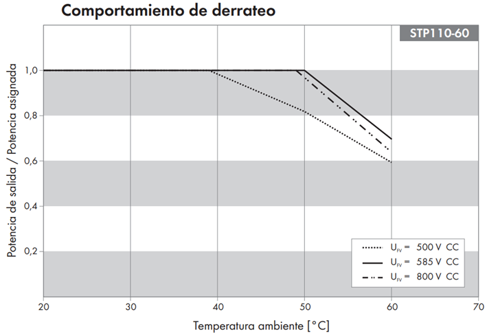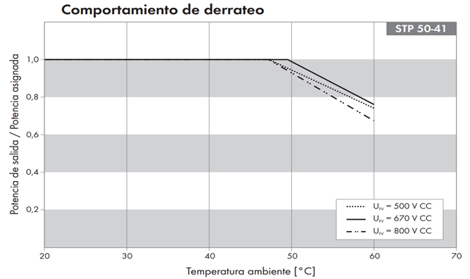 Con una tensión óptima, el equipo puede entregar el 100% de su potencia activa. En cambio, para tensiones en torno a los 800 Vdc, el equipo puede reducir su potencia a un 90 % con temperaturas ambiente de 50ºC, mientras que con Vdc de 670V, con 50ºC la pérdida de potencia máxima resulta prácticamente insignificante.