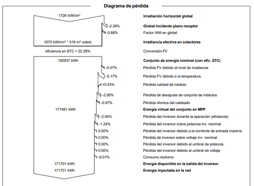 • Al analizar las posibles pérdidas generadas en inversor, se aprecia en desajuste de módulos (mismatch), cableado, eficiencia de inversor y sobrepotencia.