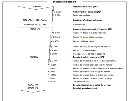 • Analizando las pérdidas generadas en inversor, se detectan en desajuste de módulos (mismatch), cableado, eficiencia de inversor y sobrepotencia. En este caso las pérdidas son del 7,5%.