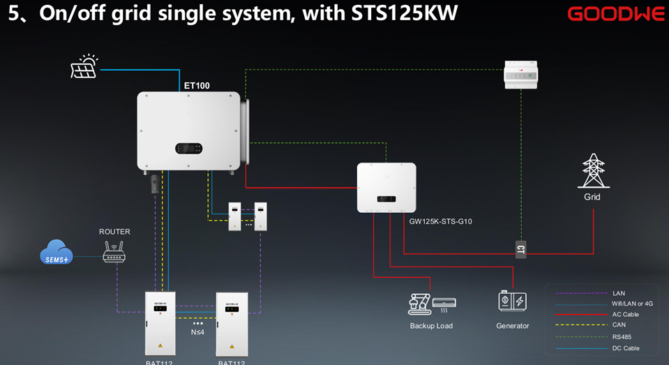 Más que un inversor híbrido, la nueva Serie ET es el corazón de un sistema diseñado para maximizar el autoconsumo y garantizar la continuidad operativa. Su integración con la batería de alta tensión BAT 112 kWh y el sistema de transferencia automática STS 125 kW permite ofrecer una solución completa y robusta para aplicaciones C&I.